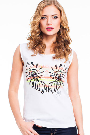 Простая белая футболка из хлопка с абстрактным рисунком на груди. Модель приталенного кроя, на широких лямках.