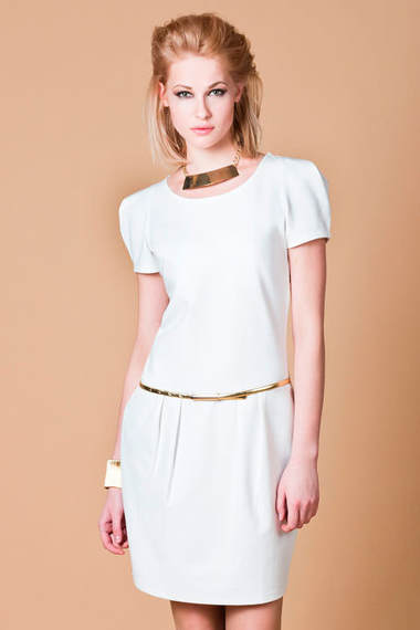 Белое платье выполнено из плотного джерси, заниженная талия, короткие рукава "фонарики", золотистый пояс входит в стоимость изделия.