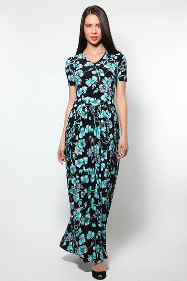 Прелестное летнее платье из микрофибры черно-бирюзовой расцветки. Модель длиной в пол, с расклешенной юбочной частью и короткими рукавами.