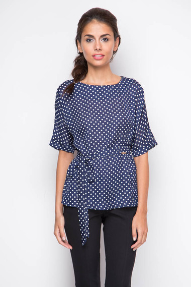 ОписаниеМодная блузка с рукавами 3/4 и вшитым поясом. Стильный принт блузки "горох" на темно-синем фоне и широкие рукава делают модель оригинальной и модной.