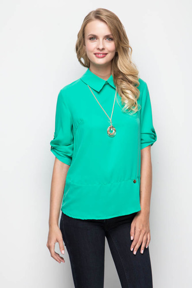 Яркая зеленая блуза из полиэстера, с застежкой на пуговицах с задней стороны изделия и классическим воротником. Длина рукава модели регулируется. Бижутерия в комплекте!